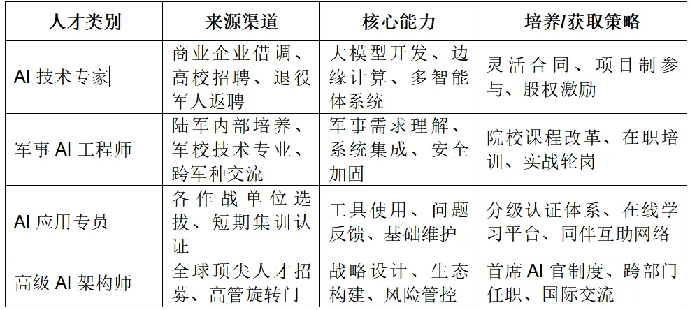 理想的人才结构需要兼顾”AI技术深度”与”军事领域知识”两个维度: