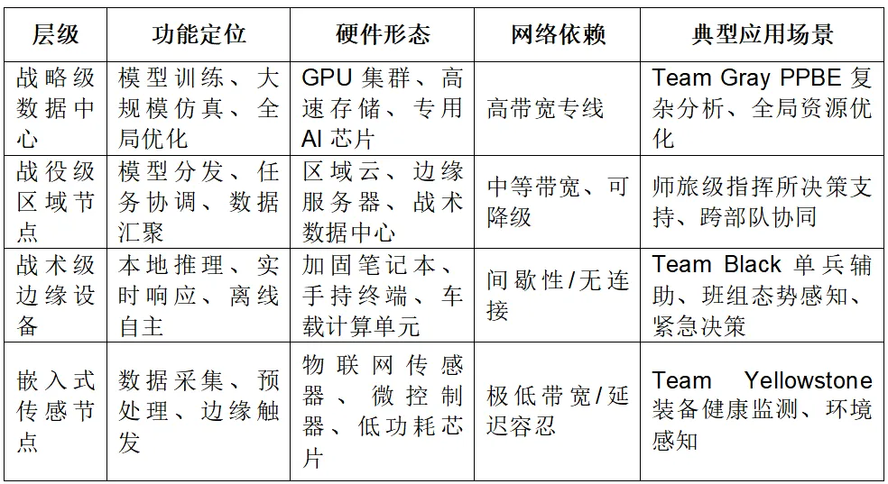 战役级指挥所(如师旅级指挥部)需要平衡能力与时效性。模型规模较战略级有所缩减,但仍保持较强的推理能力;网络连接可能间歇性可用,支持模型更新和数据同步;用户群体为专业参谋人员,可接受一定程度的交互复杂性。