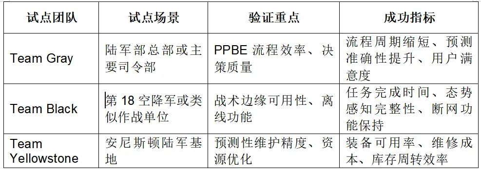 Team Yellowstone的安尼斯顿陆军基地试点,为其他团队提供了可参照的模式。该试点选择单一基地、聚焦预测性维护特定场景,具有范围可控、目标明确、效果可量化的特点。Team Gray和Team Black的对应试点,可能选择特定类型的指挥部或作战单位,在真实业务负载中检验AI工具的实际效用。试点成功的标准不仅包括技术指标达成,更关键的是用户接受度,作战人员是否愿意在日常工作中持续使用这些工具。