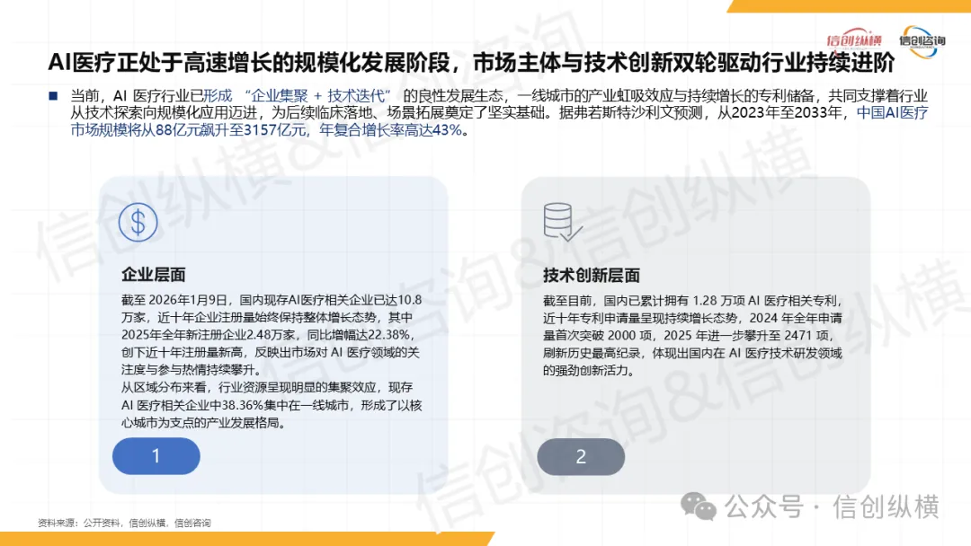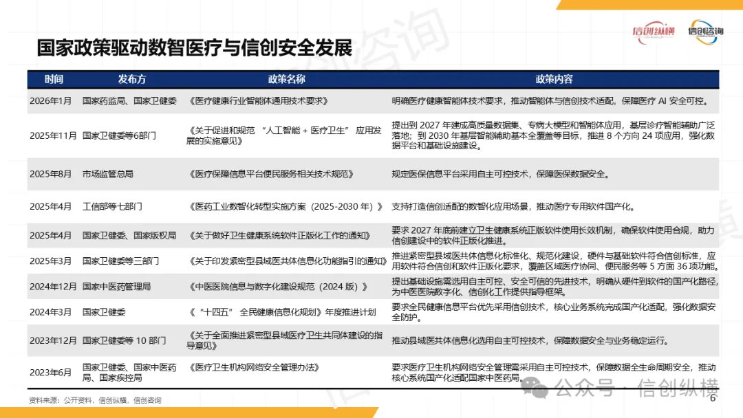 2026年全国两会政府工作报告明确将生物医药升格为支柱产业,“十五五”规划纲要单独成篇部署数智化发展,提出全面实施“人工智能+”行动,赋能医疗等民生领域。与此同时,国际上AI医疗技术迭代加速,数智医疗信创已从政策引导进入规模落地的关键阶段,成为保障医疗安全、培育新质生产力的重要支撑。