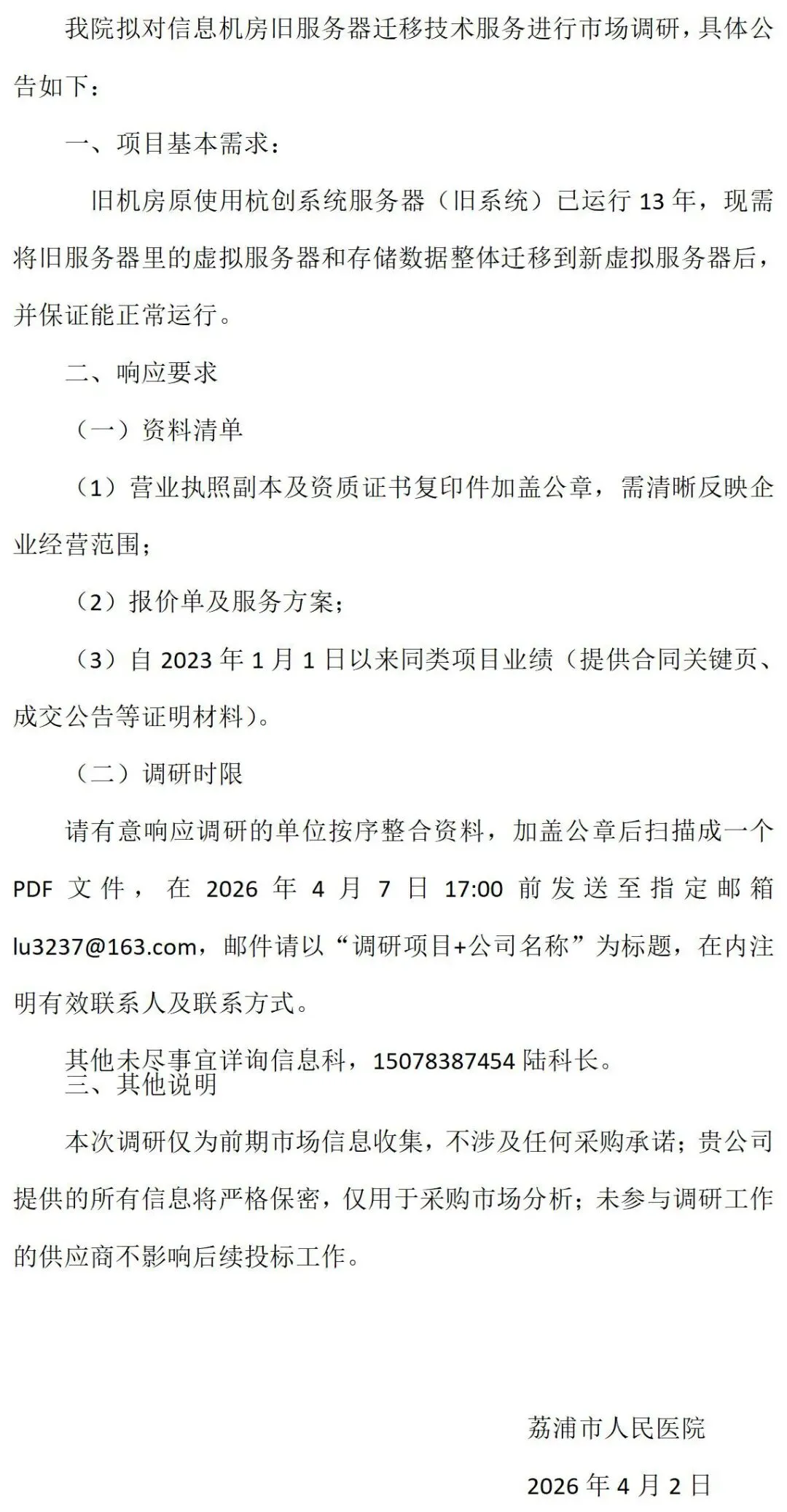 荔浦市人民医院旧服务器迁移技术服务市场调研公告