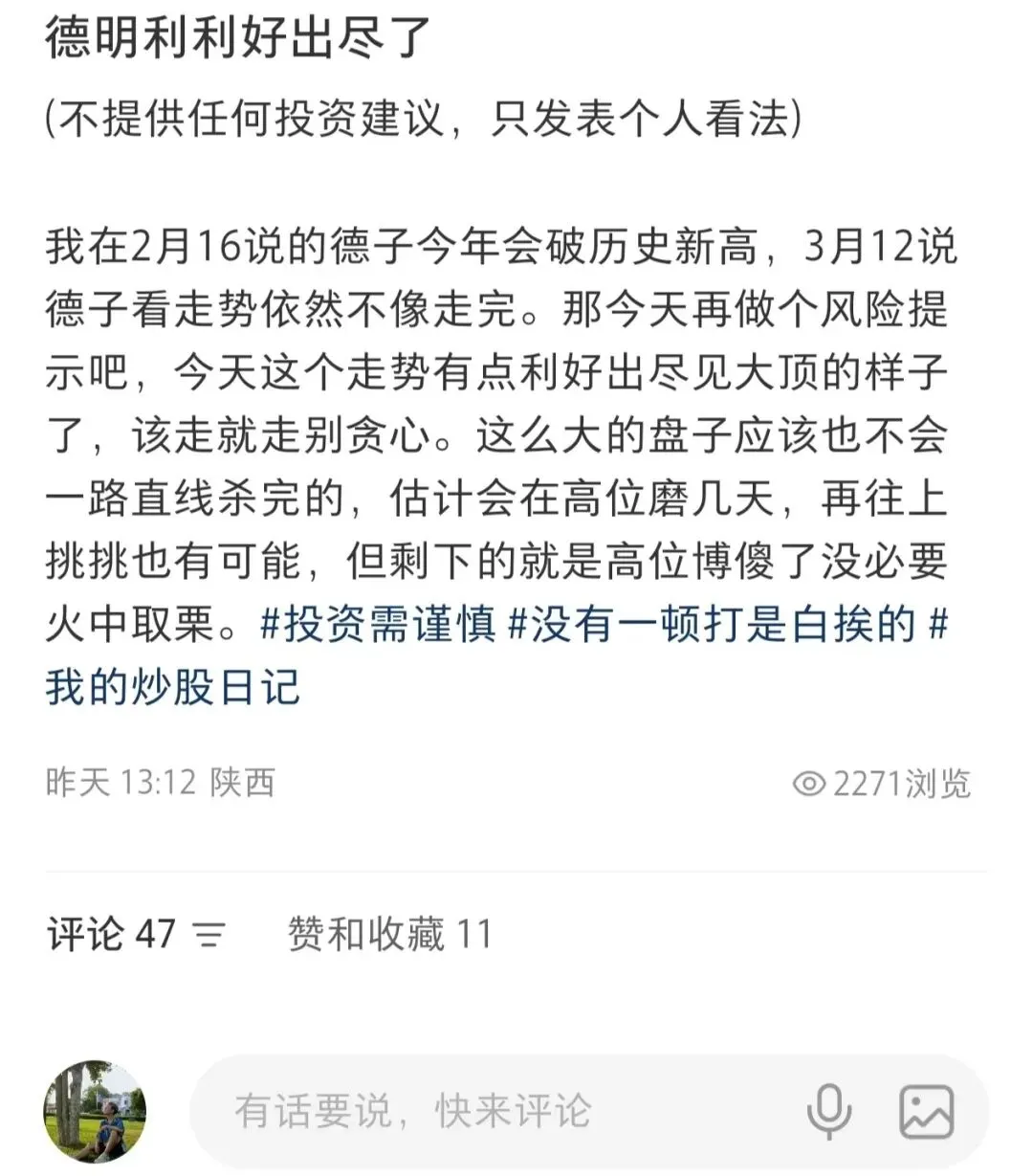 我在另一个平台的账号中多次更新对于dml的关注,在2月3月一直没来由暴涨时都判断它没有涨完,却在昨天业绩报炸裂超预期的时候发了风险提示,判断它可能利好出尽进入价格顶部了。