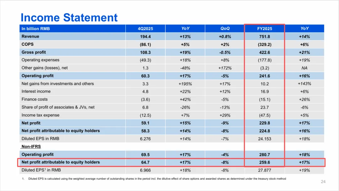 这里再划个重点,我建议大家优先看经调整净利润,而不是只看归母净利润。因为归母净利润里可能包含了一些一次性的利润,比如卖了一栋楼、卖了一家子公司,这笔钱不是每年都有的,而经调整净利润剔除了这种一次性的因素,更能真实反映这家公司主业的赚钱能力。比如腾讯 2025 年的财报,它的经调整净利润是 2596 亿,同比增长了 17%,这个数字就很干净,说明它的主业一直在源源不断赚钱,而且还有增长。