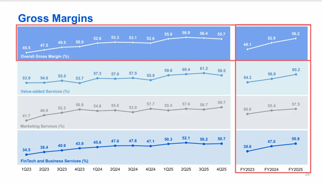 除了净利润,还要看两个指标:毛利率和净利率。毛利率很简单,就是收入减掉直接成本,毛利率越高,说明这个公司的产品越有定价权,越不用去卷价格,赚钱效率越高。比如腾讯的毛利率从 2024 年的 52.9% 涨到了 56.2%,说明它整体的赚钱效率还在