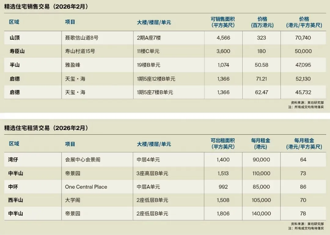 至于豪宅市场方面,尽管《财政预算案》宣布,楼价超过港币1亿元的住宅物业从价印花税由4.25%上调至6.5%,由于豪宅买家对印花税的敏感度较低,预期相关措施对整体成交量的影响有限。 二月份豪宅市场持续保持活跃。