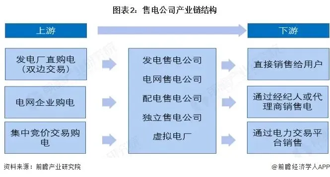 售电公司的上游购电渠道主要包括发电厂直购电(双边交易),电网企业购电以及集中竞价交易购电;中游售电主体包括发电售电公司、电网售电公司、配电售电公司、独立售电公司以及虚拟电厂;下游销售渠道主要有:直接销售给用户,通过经纪人或代理商销售,通过电力交易平台销售。