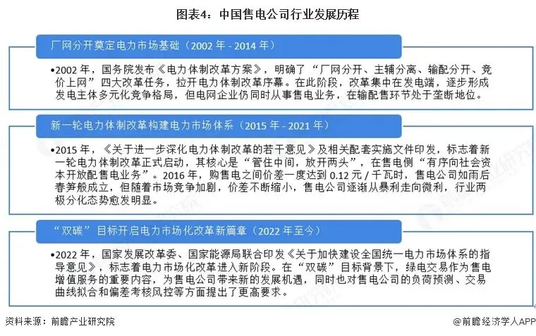 中国售电公司的发展历经三个阶段:2002-2014年,以2002年《电力体制改革方案》为标志,通过厂网分开形成发电端多元竞争格局,但电网企业仍垄断售电业务,存在用户选择权低、成本核算不明等问题;2015-2021年,新一轮电改启动,以“管住中间,放开两头”为核心开放售电侧,初期售电公司盈利丰厚,后因竞争加剧出现行业洗牌;2022年至今,在“双碳”目标推动下,绿电交易带来新机遇,同时对售电公司的专业能力提出了更高要求。
