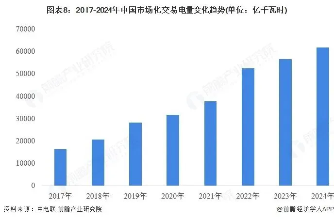 根据中电联数据,2017-2024年,中国市场交易电量及其占全社会用电量之比逐年上涨。2024年1-12月,全国电力市场交易电量61796亿千瓦时。