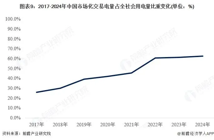 近年来售电市场化交易成为重要销售渠道,2017-2024年中国市场交易电量占全社会用电量比重逐步提升,2024年占比约62.7%。