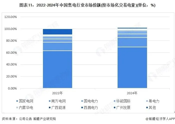 从售电行业市场份额来看,2024年国家电网市场化交易电量约占全社会市场化交易电量的70%,南方电网占16%。2022-2024年,国家电网、南方电网、国电电力、华能国际、粤电力等企业市场占比均有所提升。