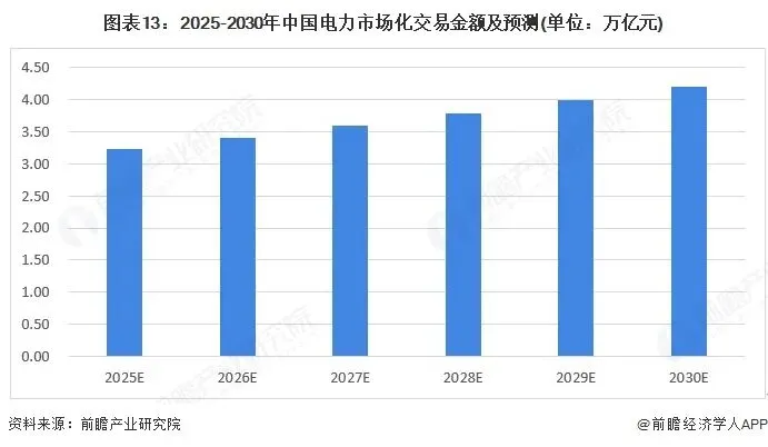 2025-2030年中国平均上网结算电价将呈现前降后稳态势:2025-2027年受新能源放量、煤价下行驱动年均下降2%-3%,2028年后因储能调节能力提升、碳成本纳入趋于稳定,预计2030年全国均价降至较2024年下降12%-18%,结合2025-2030年中国电力市场交易预测数量情况,前瞻初步统计2030年我国电力市场交易金额约4.20万亿元。