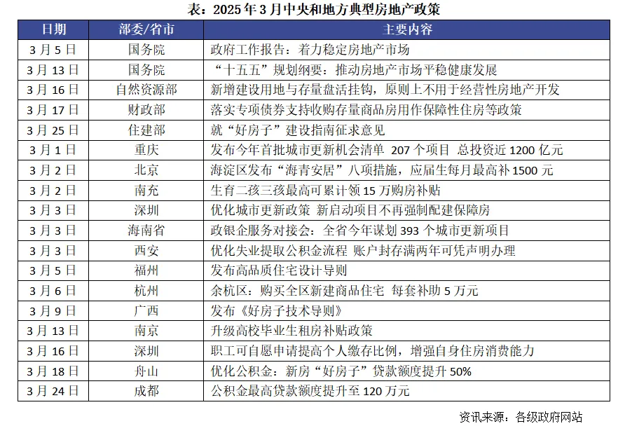2026年3月,全国两会《政府工作报告》明确,将着力稳定房地产市场,并将其列入“十五五”规划工作方向。自然资源部发布38号文,明确新增建设用地与存量盘活挂钩,原则上不用于经营性房地产开发。地方层面,至截稿时58次发布稳市场新政,从发布频次统计来看,公积金优化提及次数最多,主要涉及贷款额度提升、首套房贷认定放宽等方面,城市更新方面,深圳宣布优化城市更新政策,新启动项目不再强制配建保障房。