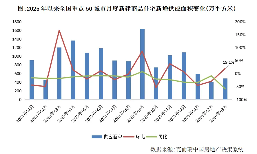 克而瑞监测数据显示,2026年3月,全国重点50城市新建商品住宅新增供应面积约488万平方米,环比增加19%,整体供应规模仍处低位。一季度累计供应面积1487万平方米,累计同比跌42%。