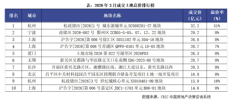 但土拍热度如期回落,3月平均溢价率为3.1%,环比2月全月下降6.1个百分点,同比下降12.5个百分点。这一方面是由于一二线城市城更地块成交量增加,另一方面是三四线成交占比上升所致。不过杭州城东新城、上海青浦宅地依然实现溢价成交。