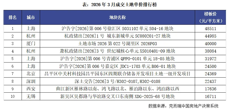 单价榜方面,半数席位来自于上海、杭州。榜首地块为徐汇区长桥地块。地块前身为原大华医院用地,商业占比25%,容积率为2.0,总规划建筑面积5.51万平方米,住宅部分可售楼板价6.5万元/平方米,如期由上实城开以底价26.75亿元竞得,平均楼板价4.85万元/平方米。建筑限高80米,绿化率不低于35%,商品住宅装修标准起始为4000元/平方米。