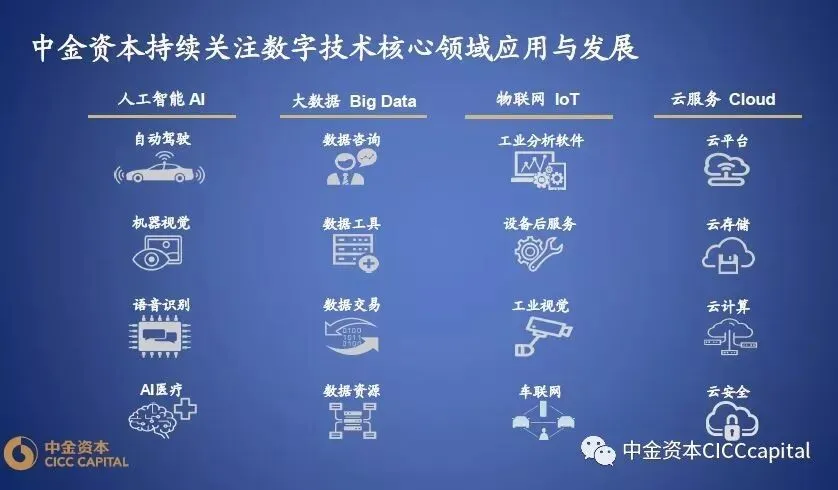 在我们看来,首先,智能技术加速普惠化,智能设备持续泛在化,典型的代表是视觉、语音语义等人工智能技术在安防、消费电子、金融等领域比较成熟的应用,以及未来在交通出行、医药等领域拥有的巨大想象力;其次,作为人工智能的基础,数据的量变带来质变,数据已经成为越来越重要的资产,而数据的本质则是在不断的将人类活动、物理世界数字化,已经能看到大数据技术在精准营销、金融征信等领域的应用,呈现出数字咨询、数据工具、数据交易、数据资源等多种业态;第三,物联网的应用有望加速更多传统行业拥抱数字化,物联网为传统行业数字化提供了必要的基础设施,如在工业互联网这一垂直领域,基于AI和大数据的工业视觉已经广泛应用,预测性维护也在应用上取得成效;最后,作为数字世界的重要载体,云计算承载了大量的数据资产以及人工智能、物联网应用,云与端的协同,有望在数字世界里实现数字资产的高效配置和协同。相应的,我们的研究也对数字化技术带来的投资机会进行了分析,并为我们的投资活动提供指导。中金资本在以对数字技术为代表的新兴产业进行投资时的三个重要基础和支点: