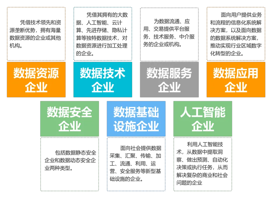 从构成来看,数智产业由五大要素撑起:数据资源、数智技术、数智产品、数智企业、数智生态。其中数智企业是核心主体,又细分为七大类——数据资源企业(如数据采集商)、数据技术企业(如AI算法公司)、数据服务企业(如数据咨询机构)、数据应用企业(如用数据优化业务的企业)、数据安全企业(如隐私计算服务商)、数据基础设施企业(如算力服务商)、人工智能企业,七类企业协同发力,构成了数智产业的完整生态。