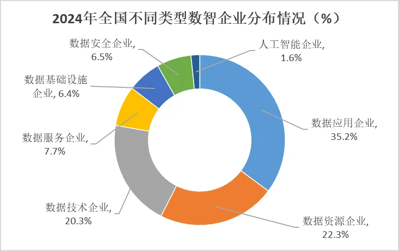 •企业数量突破40万:2024年全国数智企业数量达410467家,相当于平均每天新增超1100家。其中数据应用企业最多,有14.45万家,占比超1/3;数据资源企业、数据技术企业紧随其后,分别有9.14万家、8.33万家,而专注数据安全、基础设施的企业也各有2万多家,产业结构日趋多元。