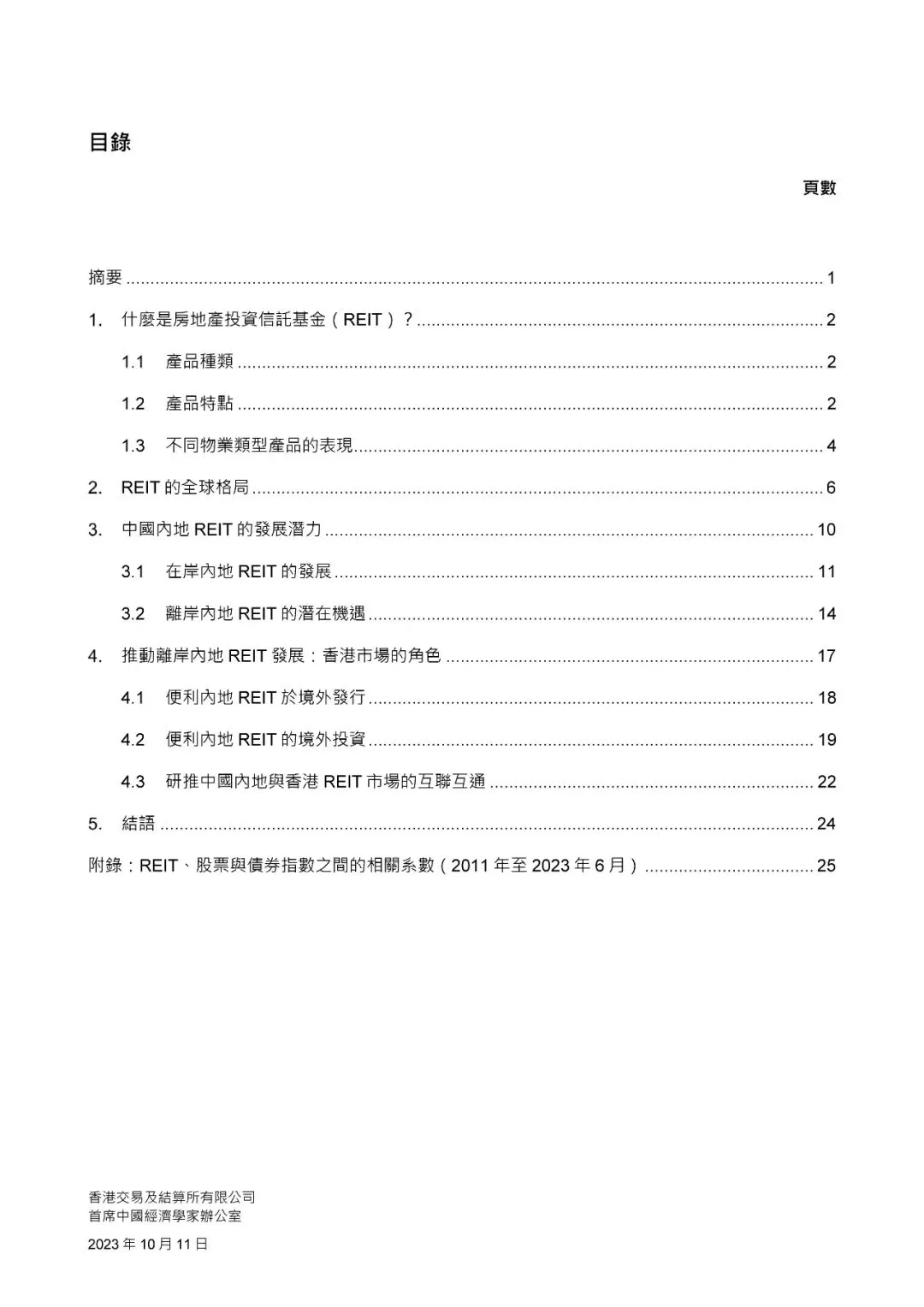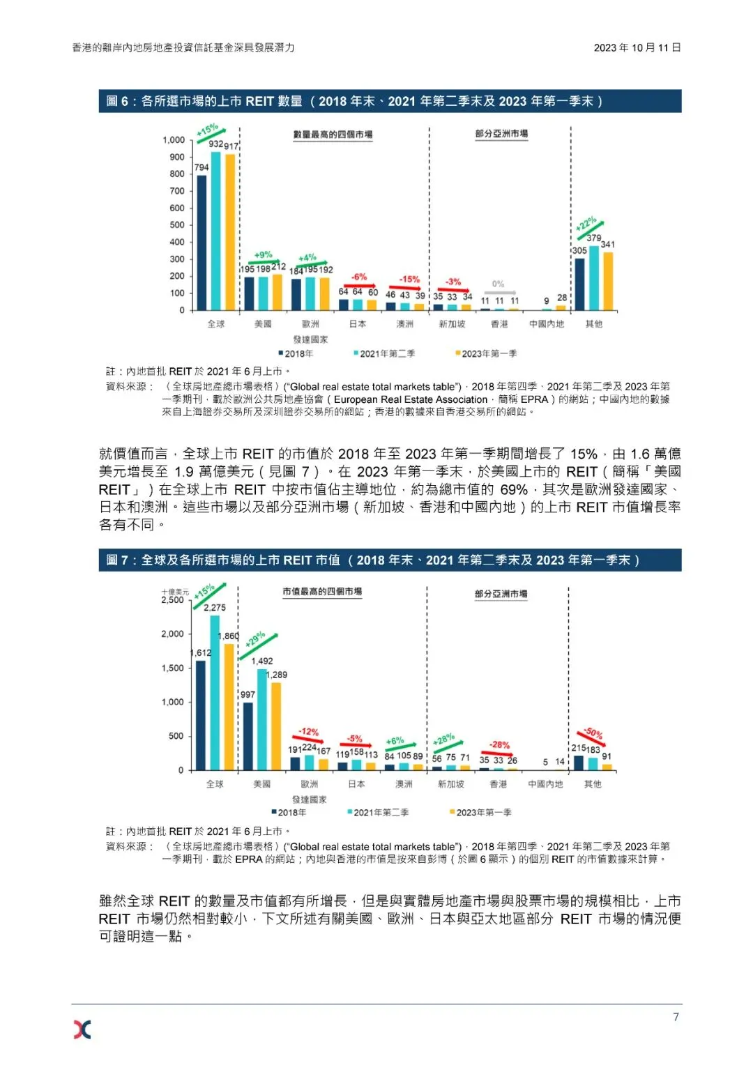 房地产投资信托基金(Real Estate Investment Trust,简称REIT)是集体投资计划的一种,目的是通过集中投资于可带来收入的房地产项目,为投资者提供定期收入。REIT 大多于交易所上市和买卖,是除股票及债券外,多元化投资策略中的另一投资选项,为投资者提供对不同类型物业的投资机会,从而获得不同价值与投资回报。REIT 的特点是其潜在的股息回报,会对被动收入投资者具吸引力。相较于直接投资实体物业,REIT 投资的优势包括易于使投资组合多元化、投资规模灵活,以及具流动性与成本效益。全球主要市场上市REIT 的规模与发展步伐各有不同。然而,与实体房地产市场及股票市场的规模相比,上市REIT 市场仍然相对较小,反映其具增长潜力。世界各地的REIT 市场在监管方面的分别,可能解释了它们发展步伐上的差异。REIT 的相关监管制度包括杠杆上限、投资限制、派息率及税务安排。全球REIT 市场的增长推动了围绕这类产品的生态圈积极发展,包括REIT 指数及交易所买卖基金(Exchange Traded Fund,简称ETF),而这反过来又有助推动REIT 市场的进一步发展。中国内地的REIT 市场虽然仍处于早期发展阶段,但是增长迅速。在“基础设施领域不动产投资信托基金”(简称“基础设施REIT”)的试点计划下,首批在岸内地REIT 于2021年6月在内地交易所上市。到2023年6月底,上市REIT 的数目增至28只。由于内地尚无相关法律规管REIT,2021年的试点计划被视作REIT 行业规范发展的正规制度。未来,预计内地对REIT 的监管制度将继续发展,以解决发行人在资产重组和收购、再融资限制及税务安排等方面的问题。鉴于发行人及投资者两方面的强劲需求,相信内地REIT 在境内外市场均有庞大发展潜力。在发行人方面,REIT 可以为内地房地产开发商提供另一种资金来源。在投资者方面,对于在寻求投资组合多元化和被动收入的全球与内地投资者而言,REIT 是极具吸引力的投资工具。2005 年,首只离岸内地REIT 在香港发行。与在岸内地REIT 相比,离岸产品在房地产类型及财务杠杆方面均为资产所有人提供更大的灵活性,也为全球投资者提供了多元化的内地房地产投资机会。此外,香港完善的REIT 监管制度为发行人及投资者参与这个市场,订立了清晰的市场监管及运作程序。香港还有相关措施配套支持REIT 在港上市,例如香港政府向REIT 发行人提供资助,额度为REIT 在香港上市涉及的合格专业服务费用的七成。2023 年,内地与香港市场的监管机构透露,双方已经开始探索将市场互联互通拓展至REIT。参考ETF获纳入沪深港通的成功经验,REIT 的市场互联互通预计将提升有关产品在两地市场的流动性,因为投资者基础将会扩大,而产品供应也会因更多发行人被吸引在两地市场发行REIT 而增加。这会有助提升香港作为全球REIT 枢纽的吸引力,以及进一步推动内地资本市场的国际化。