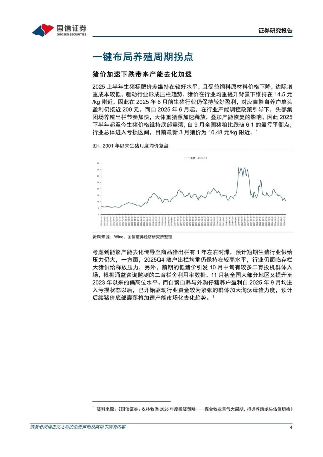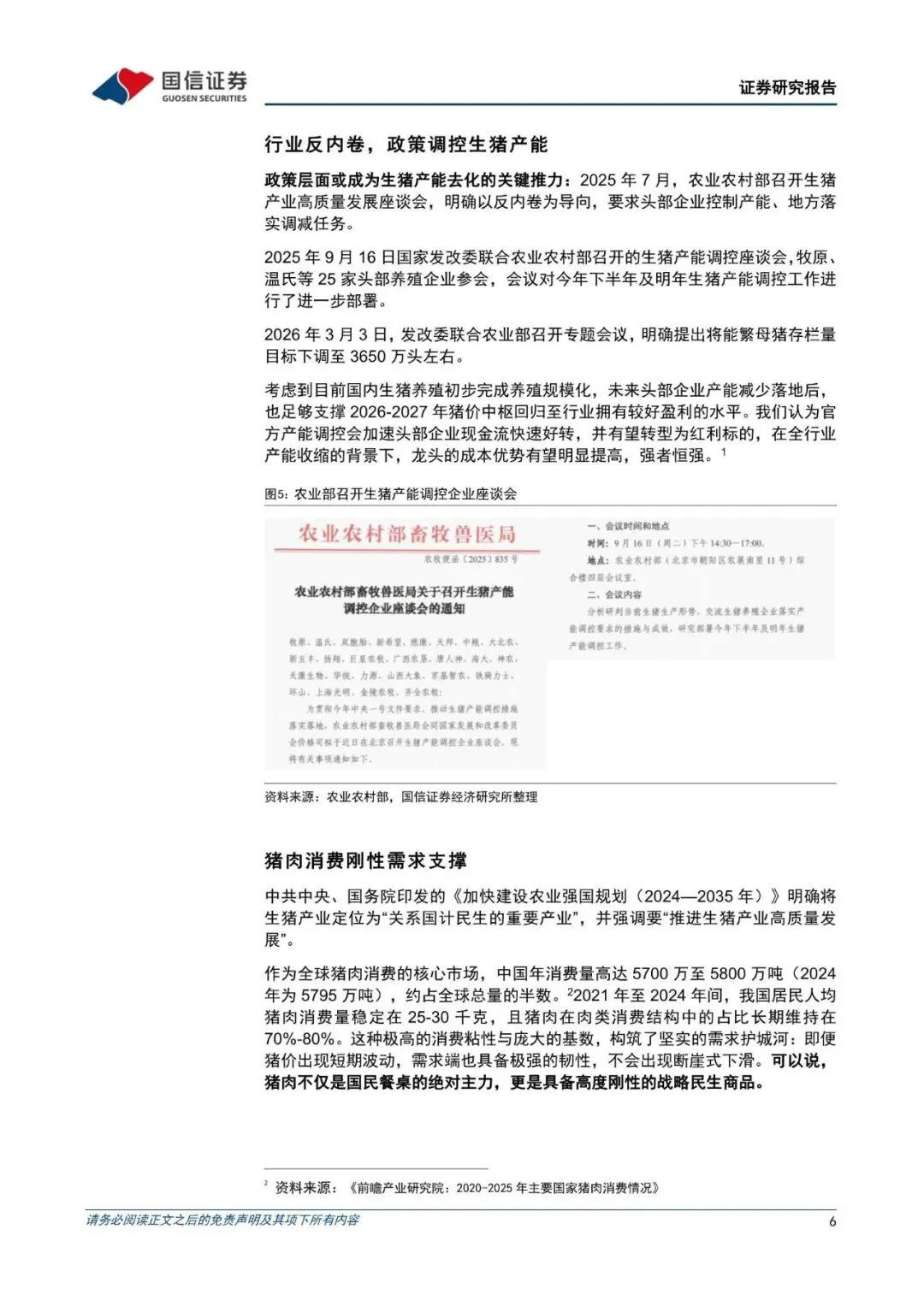 生猪养殖行业正处在周期底部的关键窗口期。自 2025 年下半年以来,猪价持续底部震荡,产能去化加速推进。2026 年 3 月,发改委联合农业部进一步将能繁母猪存栏目标下调至 3650 万头,政策调控趋严,产能收缩路径明确,为 2026-2027 年猪价中枢回归至合理盈利水平奠定基础。