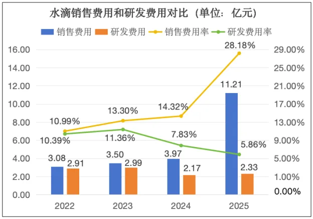 2025年全年,水滴的销售及市场推广费用高达11.21亿元,同比大幅增长61.3%,其增速远超营收增速(43.5%)。更为惊人的是第四季度,销售费用暴增178.4%至5.07亿元,占当季营收比重高达35.9%,这意味着,当季公司每收入100元,就有近36元花在了营销推广上。