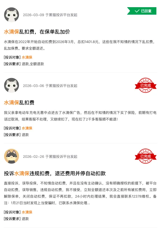 然而,与这份光鲜财报形成刺眼反差的,是同期在黑猫投诉等平台上关于水滴旗下互联网保险经纪平台“水滴保”暴增的消费者投诉,以及媒体接连曝出的“保费陷阱”事件。一面是资本市场的高歌猛进与“AI原生公司”的宏大叙事;另一面却是无数中老年人在扫码充电、线上缴费等日常场景中,于不知情下“被投保”、被连续扣费的无奈与愤怒。