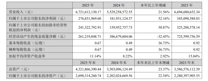 2025年,吉宏股份经营业绩实现跨越式增长,核心财务指标全面向好。报告期内,公司实现营业收入67.22亿元,同比增长21.56%;归属于上市公司股东的净利润2.77亿元,同比大增52.16%;扣除非经常性损益后的净利润2.41亿元,同比增长50.87%,盈利规模与盈利质量同步提升。