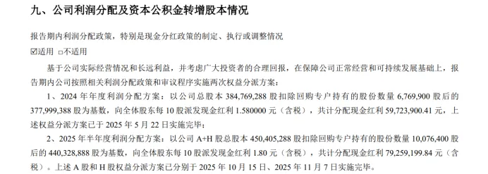 2025年共实施两次权益分派方案:2024年度利润分配:每10股派现1.58元(含税),2025年半年度利润分配:每10股派现1.8元(含税)。