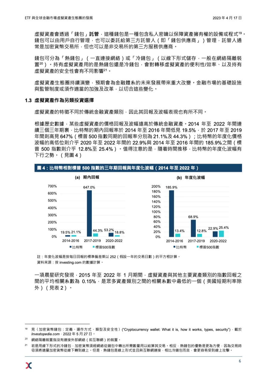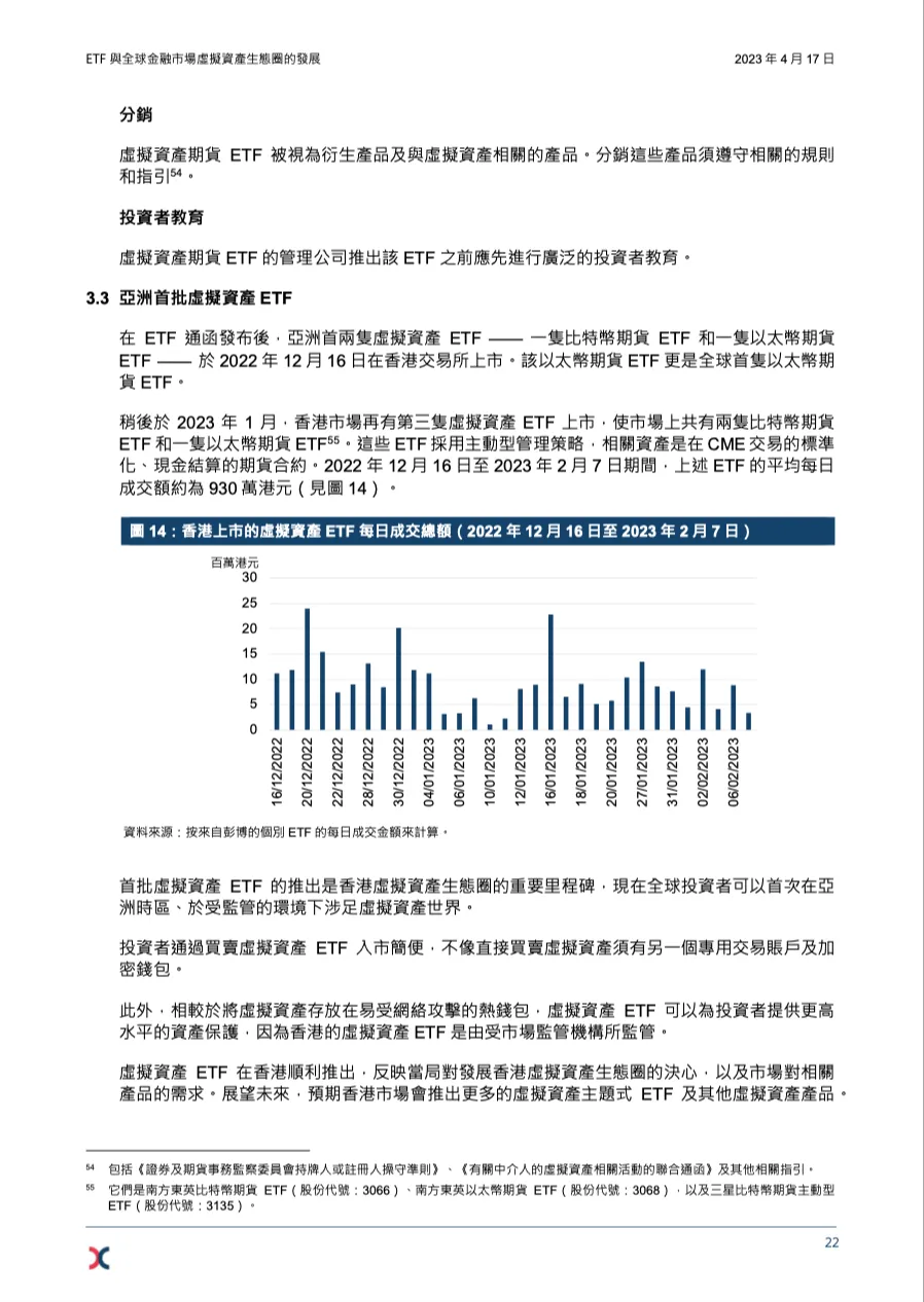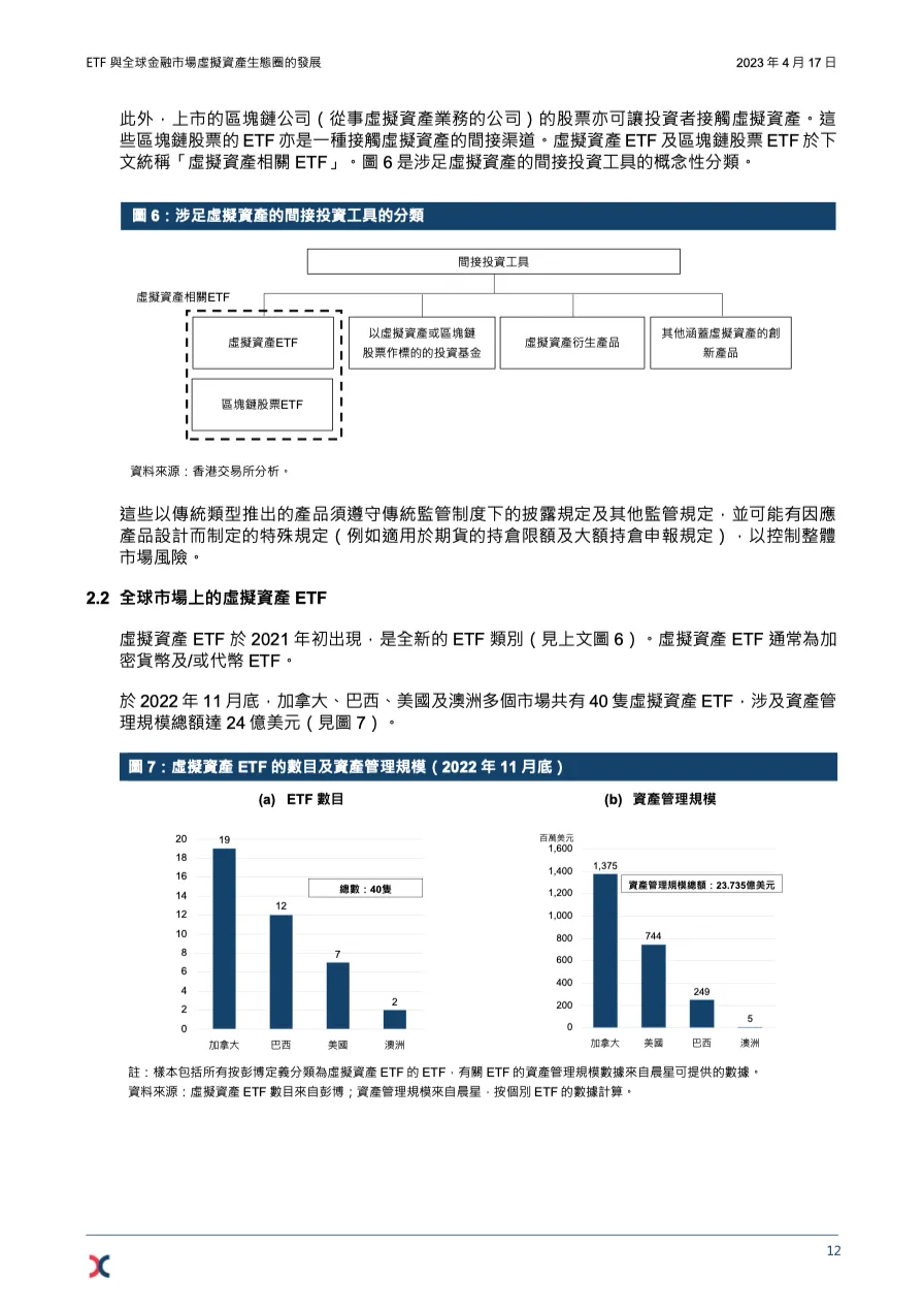 现时,投资者可透过加密资产公司直接进行虚拟资产交易,又或通过间接渠道来涉足虚拟资产,这些间接渠道包括加密货币衍生产品、交易所买卖基金(Exchange Traded Fund,简称 ETF)与其他投资基金,以及区块链公司的股票。近年,全球市场上已经推出了形形式式且投资风格各异的虚拟资产ETF。虽然虚拟资产ETF的风险回报表现一般有别于传统金融资产,可提供多元化的投资机遇,但它们也可能带来更大的风险。截至2023年1月,香港市场已有两只比特币期货ETF和一只以太币期货 ETF上市,成为亚洲首个提供虚拟资产ETF的市场。监管制度上的不断完善,预期会有助香港市场虚拟资产生态圈的发展。点击下方链接