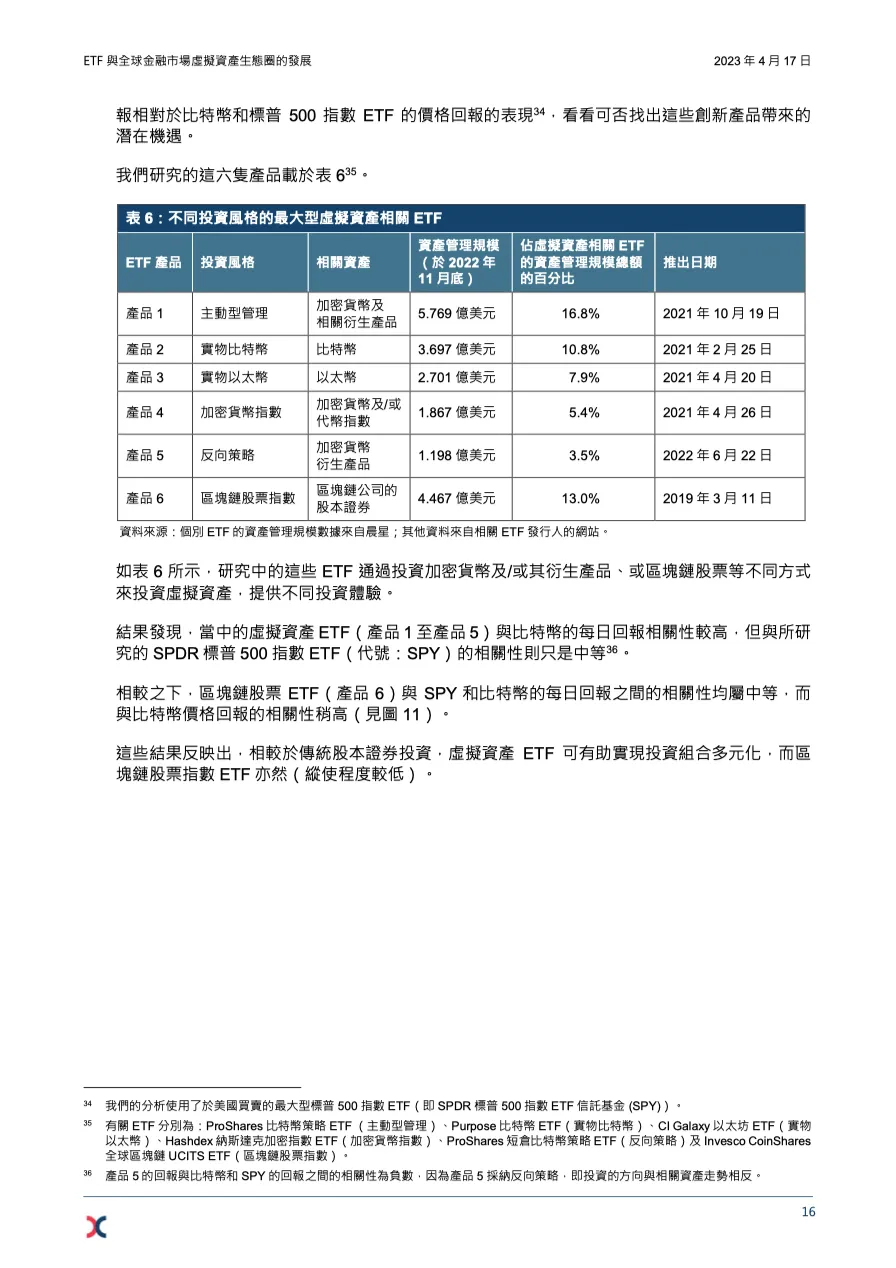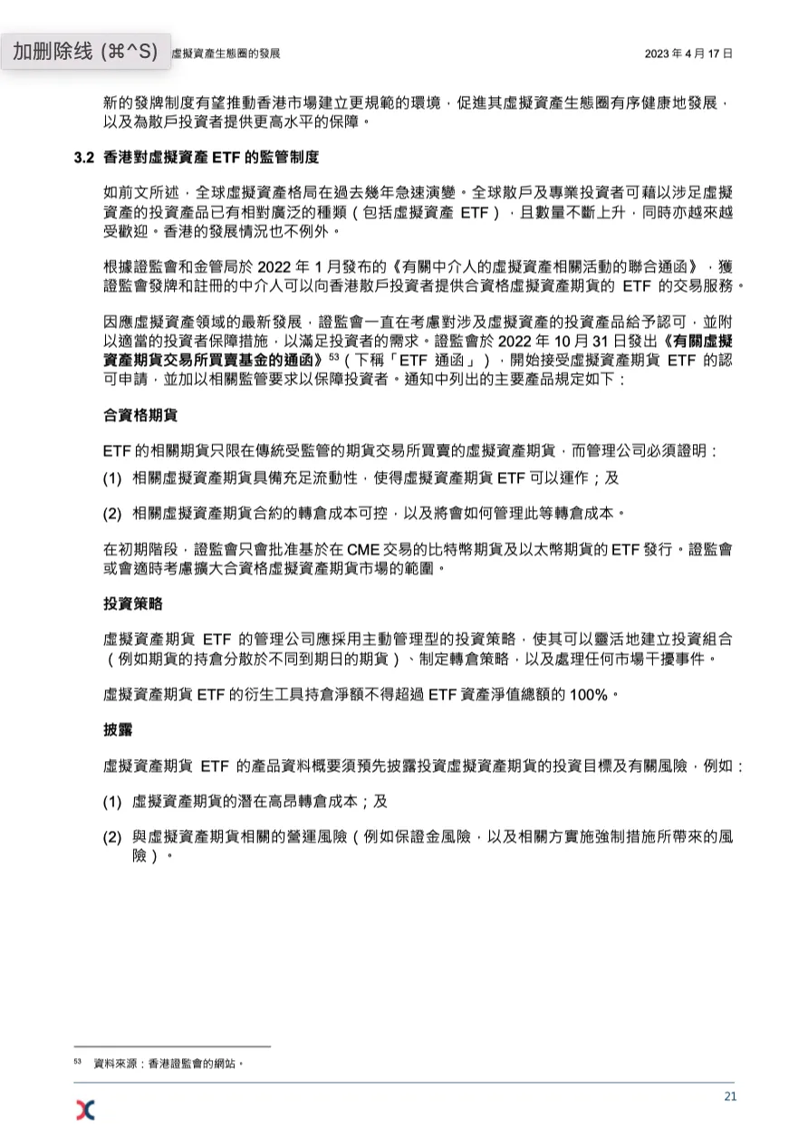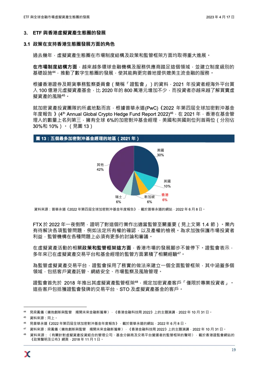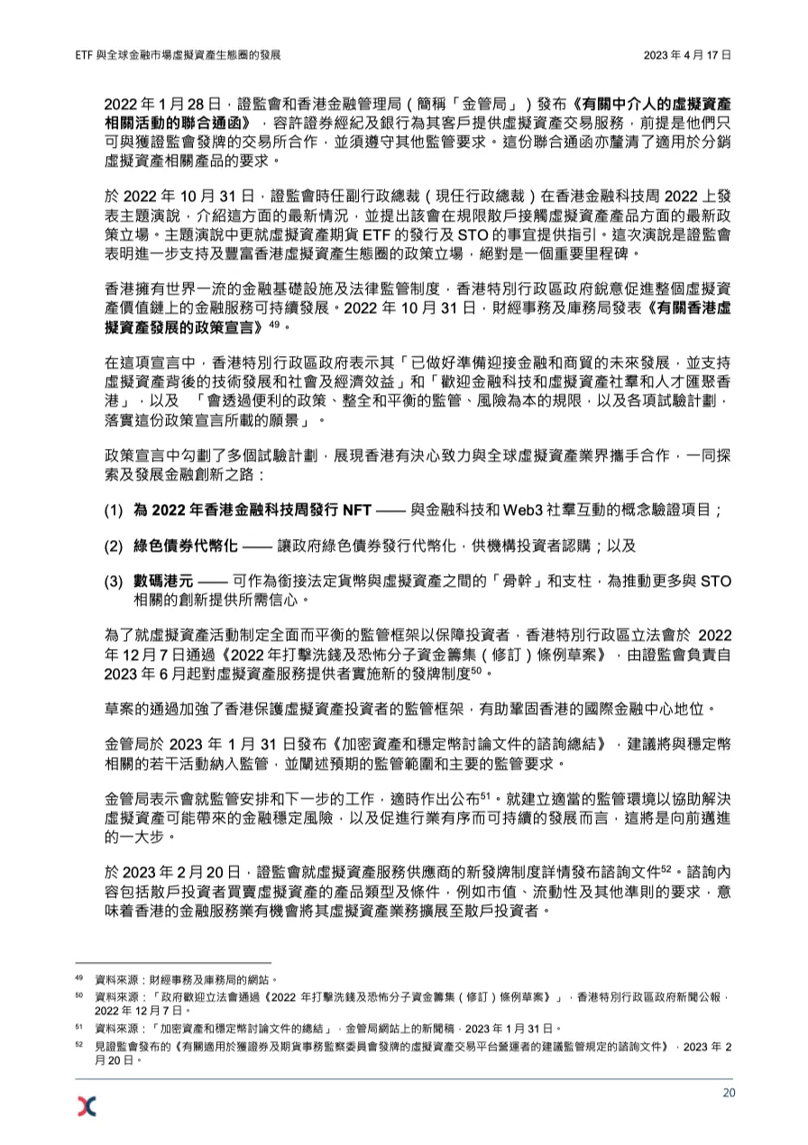 现时,投资者可透过加密资产公司直接进行虚拟资产交易,又或通过间接渠道来涉足虚拟资产,这些间接渠道包括加密货币衍生产品、交易所买卖基金(Exchange Traded Fund,简称 ETF)与其他投资基金,以及区块链公司的股票。近年,全球市场上已经推出了形形式式且投资风格各异的虚拟资产ETF。虽然虚拟资产ETF的风险回报表现一般有别于传统金融资产,可提供多元化的投资机遇,但它们也可能带来更大的风险。截至2023年1月,香港市场已有两只比特币期货ETF和一只以太币期货 ETF上市,成为亚洲首个提供虚拟资产ETF的市场。监管制度上的不断完善,预期会有助香港市场虚拟资产生态圈的发展。点击下方链接