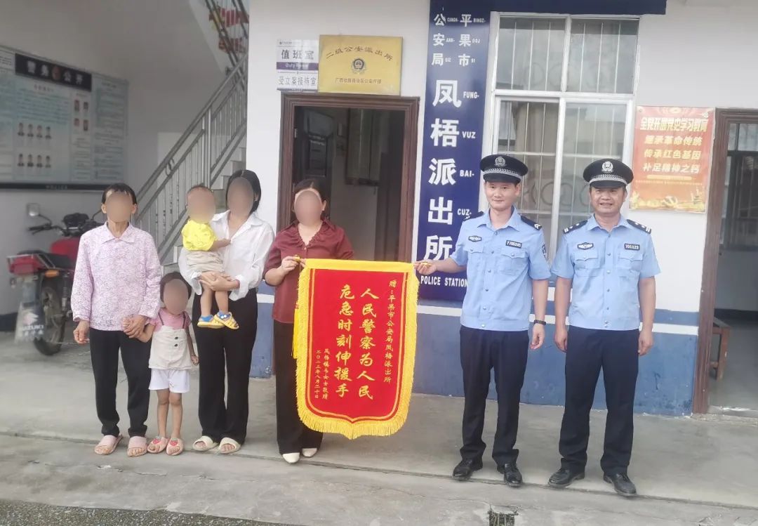 8月20日,平果市凤梧镇村民将一面“人民警察为人民 危急时刻伸援手”的锦旗送到平果市公安局凤梧派出所,对平果公安民警辅警在危急之时出手救助表示衷心地感谢。