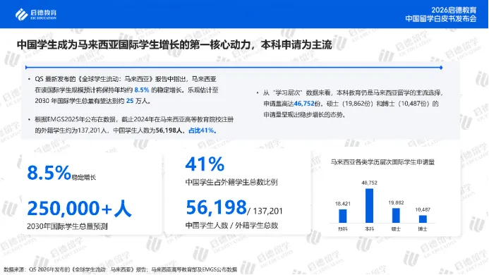 在香港、新加坡等亚洲热门目的地升学竞争日趋激烈、申请门槛持续抬高的背景下,东南亚以高性价比成为新趋势,其中马来西亚表现最为亮眼。2024年马来西亚外籍学生中中国学生占比41%(56198人),预计2030年国际学生总量有望达到25万人。从“学习层次”数据来看,本科教育仍是马来西亚留学的主流选择,申请量高达46,752份。