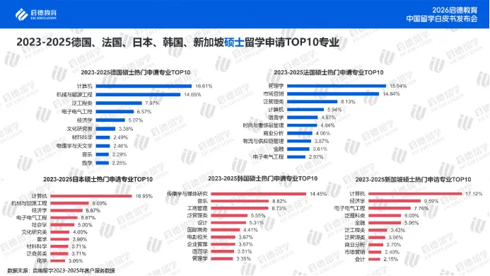 不同国家的专业偏好各有特色,以硕士阶段为例,启德留学客户服务数据显示:在美国,商业分析是第三大申请专业;在法国,管理学位列第一,时尚与奢侈品管理排第六;在韩国,传播学与媒体研究高居首位,音乐与设计分别位列第二和第五;在德国,电子电气工程排名第四,材料科学位居第七。在中国香港,计算机专业位列第一,传播学与媒体研究位列第二,金融位列第四。