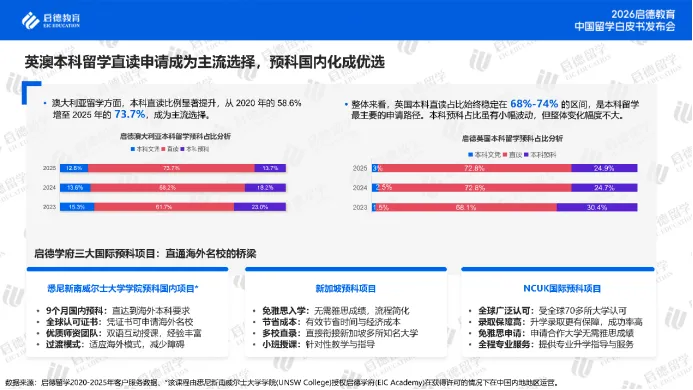 受留学预算影响(四成学生预算31-60万),预科国内化成为热门选择。启德留学调研数据显示,澳大利亚本科直读比例从2020年的58.6%升至2025年的73.7%,英国本科直读占比稳定在68%-74%。