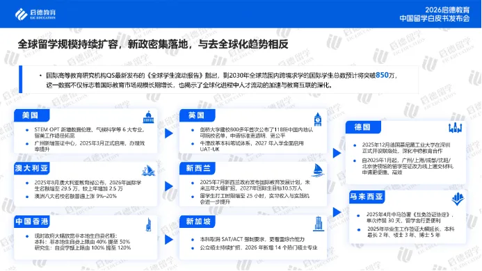 与去全球化趋势相反,全球留学规模持续扩容,QS预测2030年全球国际学生将突破850万,各国纷纷推出利好政策吸引生源: