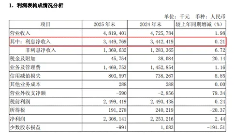 此外,作为银行最核心的盈利来源,其利息净收入的增长也近乎原地踏步。该行2025年全年利息净收入34.50亿元,仅增长0.21%,对营收的拉动作用微乎其微。
