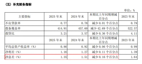 这一停滞背后,是净息差的持续收窄。2025年,无锡银行净息差降至1.35%,较上年减少0.16个百分点。净息差可以理解为银行“放贷利率”与“存款利率”之间的差额,是衡量一家银行传统业务盈利能力的关键指标。