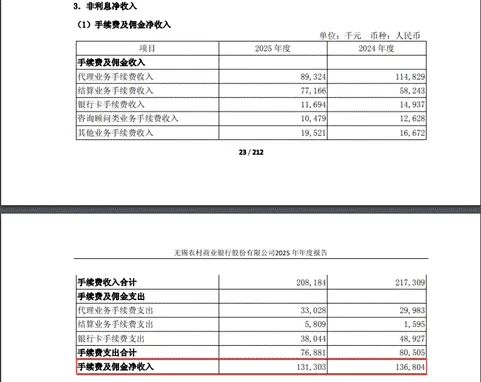 作为转型过程中的关键指标之一,无锡银行中间业务的表现低于预期。在2025年,其手续费及佣金的净收入只有1.31亿元,与2024年的净收入相比下降了4.02%,在总营收中所占的比例仅为3%。这一数据显著低于城商行6.3%的行业平均水平,与其提出的核心目标“中间业务占比达15%”相去甚远。