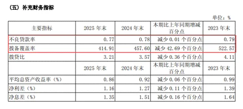 然而,看似稳健的资产质量却也隐藏着风险。该行2025年拨备覆盖率从上年末的457.60%骤降至414.91%,一年内下降超过42个百分点。虽然仍然远高于监管要求,但已经连续两年大幅回落。