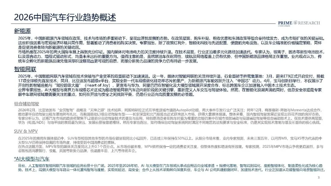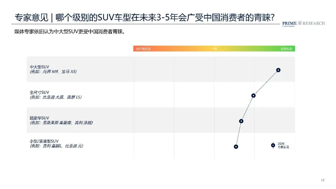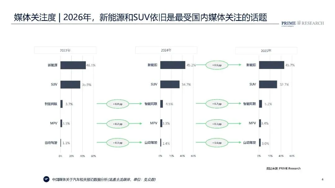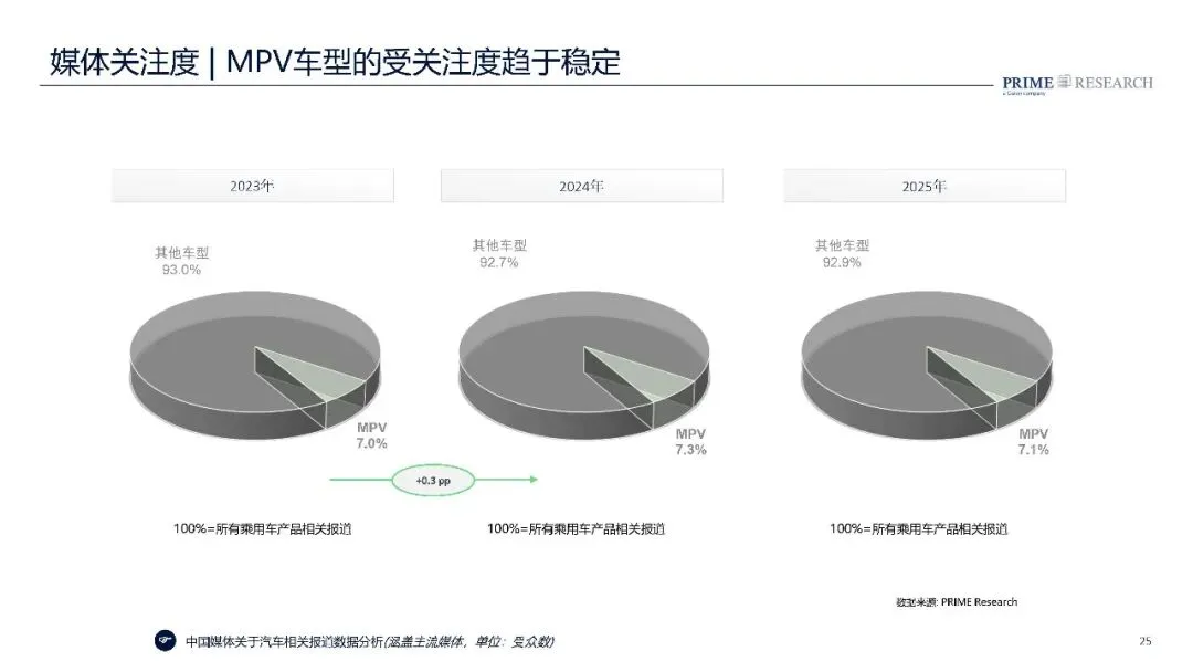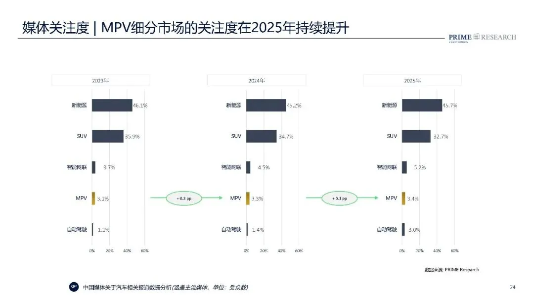 行业调研显示,未来三到五年,中大型 SUV 仍将保持较高的市场热度,持续受到中国消费者的青睐。MPV 赛道则走出了一条温和上涨的曲线,2023 到 2025 年,相关话题的媒体关注度从 3.1% 升至 3.4%,市场关注度整体趋于稳定。越来越多的市场参与者涌入这一赛道,行业预判,MPV 市场的竞争将更趋激烈。