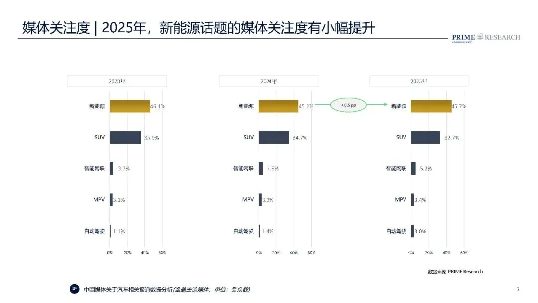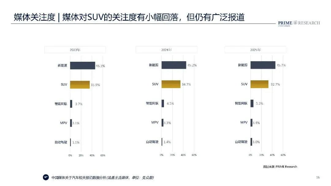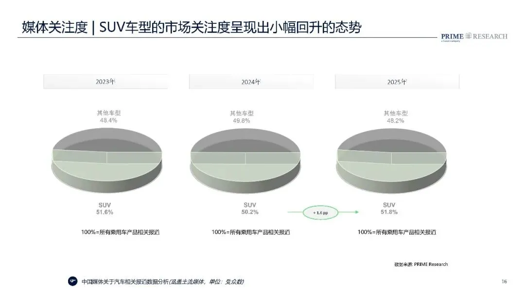 乘用车细分市场的格局,正在消费需求的变动中保持着动态平衡。SUV 车型的市场份额已连续三年保持在 50% 以上,2025 年相关报道在乘用车领域的占比,相较此前出现了小幅回升。即便 2023 到 2025 年,SUV 话题的整体媒体关注度从 35.9% 回落至 32.7%,但依旧是仅次于新能源的第二大热门赛道。