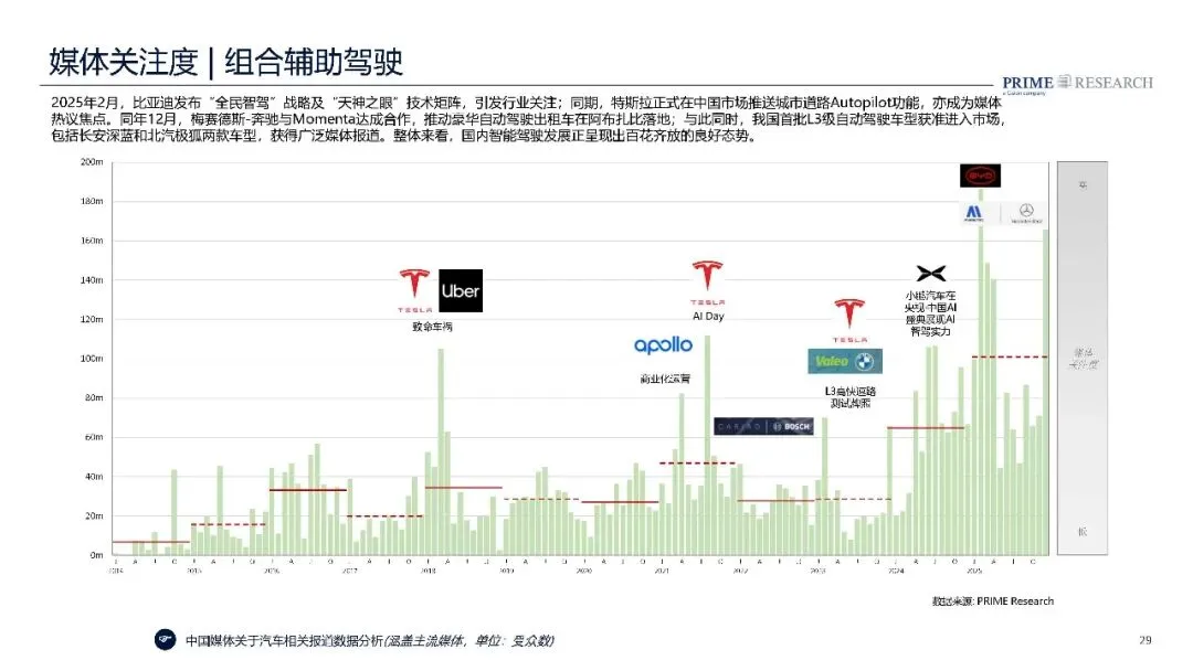 组合辅助驾驶的普及,正在让智能化真正走进普通消费者的用车生活。2023 到 2025 年,自动驾驶相关话题的媒体关注度从 1.1% 涨至 3.0%,是车市热度跃升最明显的领域。行业调研显示,近期汽车市场的核心趋势,集中在 L2 级部分自动驾驶技术的普及与应用。消费者在购车决策中,最为看重的辅助驾驶功能,集中在城市领航辅助与高速辅助驾驶两大方向。头部技术方案商的成熟产品,正在推动辅助驾驶技术快速下探,从高端车型向主流消费市场全面覆盖,让更多普通消费者能够接触并使用到成熟的辅助驾驶功能。