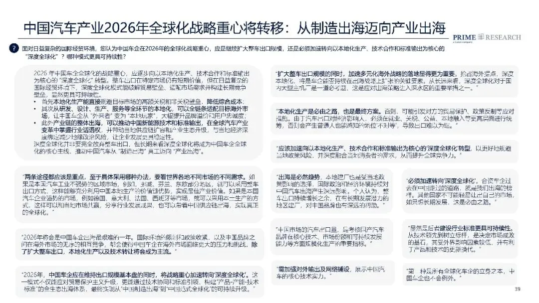 国内市场的充分竞争,也推动着中国车企全球化战略的深度转型。行业形成的普遍共识是,2026 年中国车企的全球化战略重心,将逐步从整车出口的制造出海,转向以本地化生产、技术合作和标准输出为核心的产业出海。这种深度全球化的模式,能够直接规避目标市场的贸易壁垒,通过全链条的本地化适配,深度贴合当地市场的消费需求,更能推动中国新能源汽车技术与标准的全球输出,在全球汽车产业变革中掌握更多话语权。整车出口仍会在特定市场保留短期价值,但长期来看,深度全球化将成为中国车企出海的核心主线。