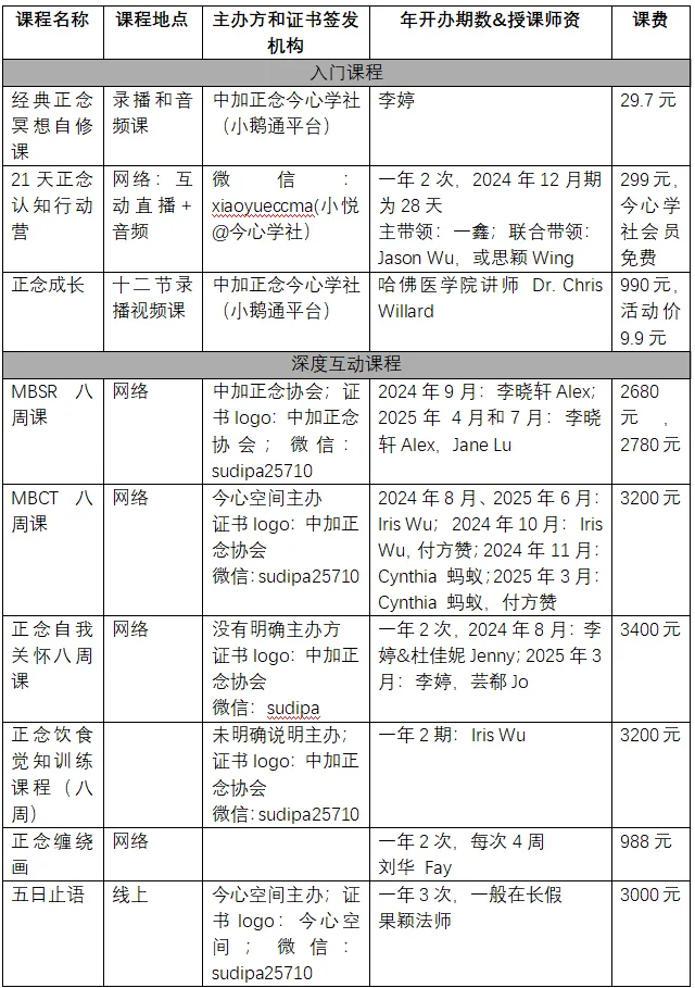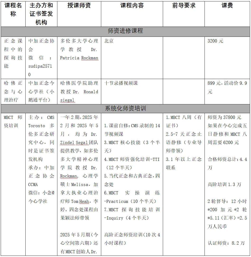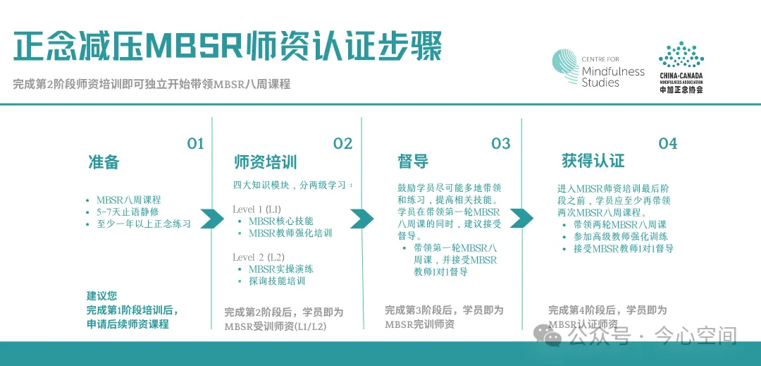 今心空间的MBCT师资以中加正念协会CCMA为承办方,CMS为主办方和授证方来开展,参与者完成了MBCT八周课和五日止语静修后,报名该师资课程可以9个月内完成全部培训,完成后颁发“MBCT合格师资证书”,如果先导课和师资课均在今心空间完成,则总价为4.4万,如果包括先导课在内的课程都在今心空间完成,也有可能1年之内完成整个培训。