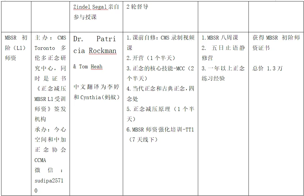 MBSR师资仍然是和CMS合作,完成后颁发《正念减压MBSR L1受训师资》,总价为1.3万,完成后按照官方微信的介绍,还需要完成L2的学习才能正式“独立开始带领MBSR八周课”。