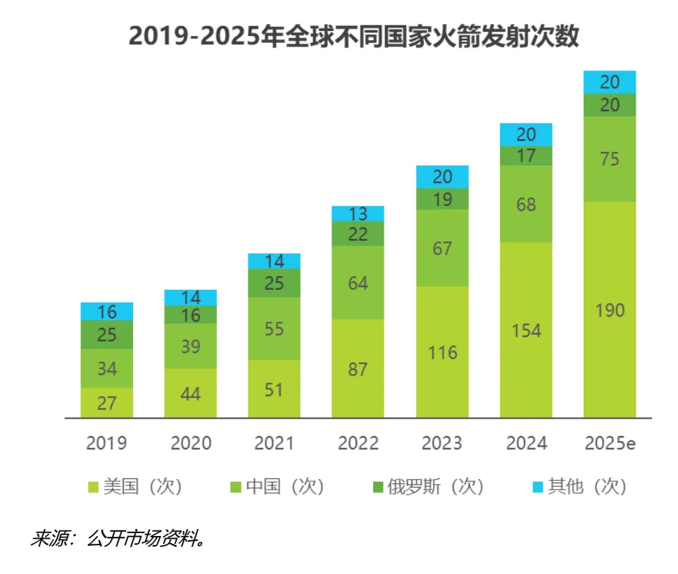从目前环境上看,从 2019 年到 2025 年,全球火箭发射次数稳定提升,直观体现了全球航天产业的蓬勃扩张。