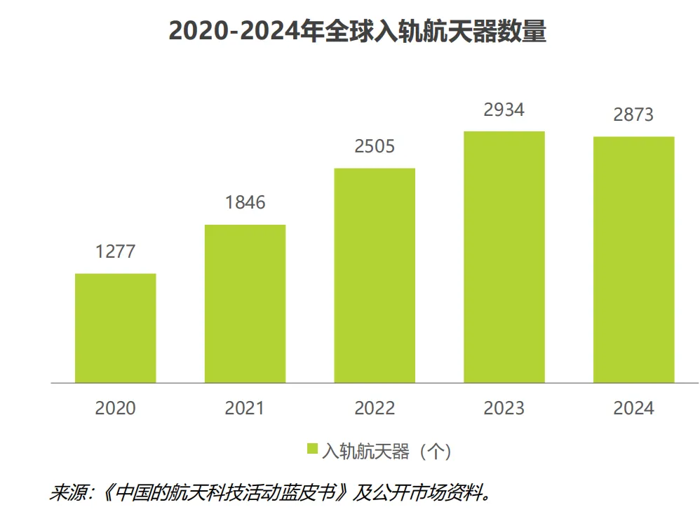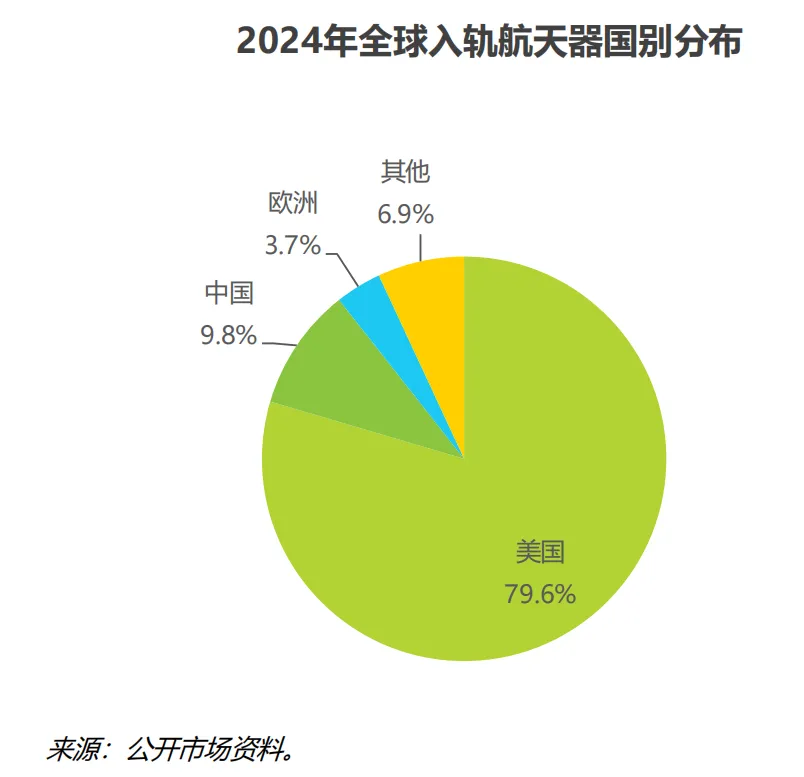 从入轨航天器统计来看,自从星链开始大规模组网后,每年的入轨航天器数量骤升至3000 个水平。2024 年这一数字达到 2873 个,其中美国占 79.6%,中国占 9.8%,欧洲占3.7%。