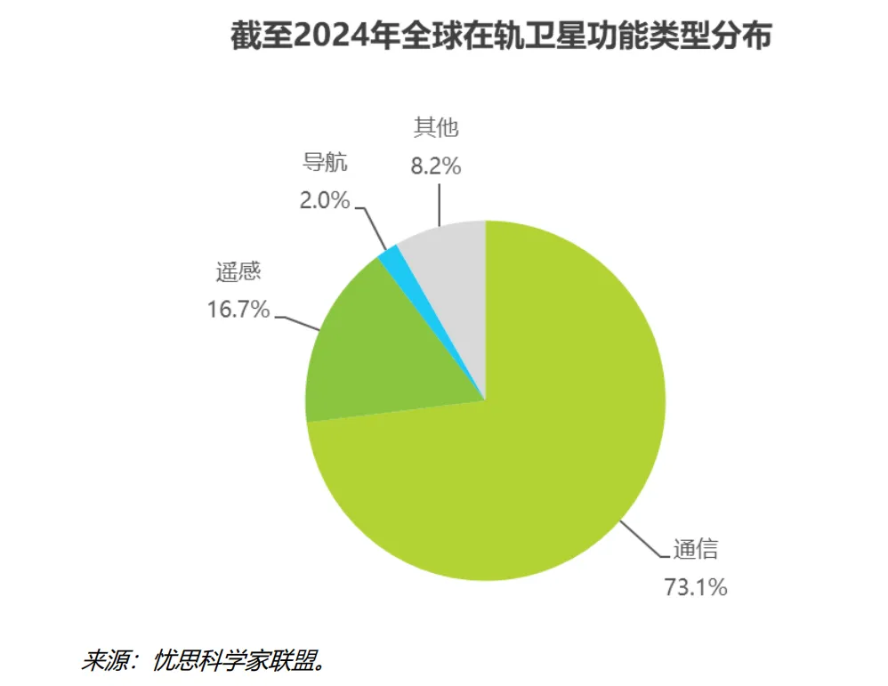 截至 2024 年,全球在轨卫星中,通信卫星的数量占绝绝大多数,比例超过 70%。排名第二的就是遥感卫星,占比达到 16.7%。低轨通信星座以大规模卫星组网和实现全球无缝覆盖为核心,近年来在加速部署 ,这一模式直接促使通信卫星数量爆发式增长,已成为全球在轨卫星的主力军。