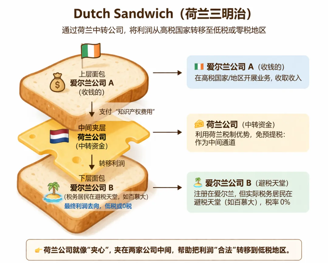 谷歌的避税措施非常经典,好吧,严谨一点,是税务筹划措施。这个措施成为了教科书中的案例 - Dutch Sandwich(荷兰三明治)。