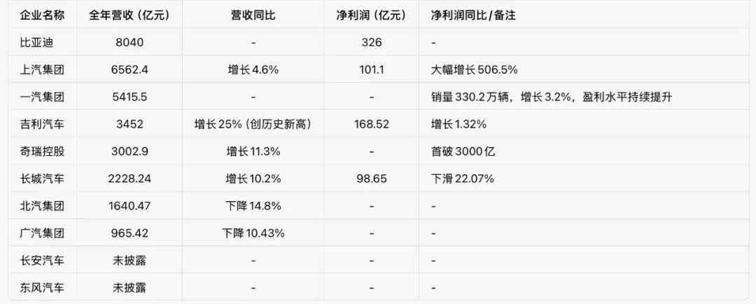 但是也要看到,2025年财报反映出公司面临“增收不增利”的财务压力。全年实现营业收入8039.6亿元,同比增长3.46%,增速为过去6年最低水平,归属于上市公司股东的净利润为326.2亿元,同比下降18.97%。24%4025年比亚全部业务的利润率仅为4%,低于国内汽车业4.1%的平均利润水平。3月18日奇瑞发布IPO后首份2025年财报,交出了一份远超市场预期的成绩单。2025年奇瑞总营收3002.9亿元,同比增长11.3%,首次突破3000亿。净利润195.1亿元,同比增长36.1%,增速远超8%的销量增速。归母净利润190.19亿元,同比增长34.6%。盈利能力持续增强,利润率从2024年的5.3%提升至6.5%,领先国内其他汽车企业。奇瑞2025年的盈利空间也受到国内价格战和内卷的影响。但是,堤内损失堤外补,海外市场的盈利弥补了国内市场的不足。2025年奇瑞海外营收1574.19亿元,占总营收52.4%,首次超过国内(1428.68亿元),同比大增56%。海外销量134.4万辆,占总销量49.2%,同比增长17.4%。奇瑞国内单车均价10.69万元,海外单车均价12.16万元,海外每辆车比国内车多赚1.47万元。海外营收成为总利润核心支柱。做为昔日的国内车企老大,在“内卷式”恶性竞争加剧、价格战此起彼伏的大环境下,2025年上汽集团实现了快速增长,一举扭转业绩连年下滑局面,超额完成目标,实现了筑底企稳,走出了低谷。2025年上汽集团经营业绩显著回升,整车销量和利润水平均比上年大幅增长。4月1日,上汽集团发布2025财年年度报告。报告显示,2025年上汽集团实现整车销售450.7万辆,同比增长12.3%,市场占有率13.1%,同比上升0.3个百分点;全年实现合并营业总收入6562.4亿元,同比增长4.6%;归属于上市公司股东的净利润101.1亿元,同比增长506.5%,归属于上市公司股东的扣除非经常性损益的净利润74.2亿元,同比增长237.2%。走出谷底,实现筑底回稳的上汽集团,清醒地认识到面临的机遇与挑战。上汽集团党委书记、董事长王晓秋在2026年新年贺词中指出,当前,改革任务依然艰巨,我们仍面临严峻的内外部挑战:国际国内两个市场亟需全力开拓、用户洞察与爆款打造的能力仍需持续提升、智电技术的迭代与升级还要不断提速。我们必须始终保持危机感和使命感,时不我待,只争朝夕,与时代同频,与用户同行。王晓秋表示,2026年是"十五五"规划的开局之年,上汽集团将进一步深化改革,坚持稳中求进,锚定智能化、电动化主航道,扎实推进改革攻坚,巩固回升向好态势,全面构建高质量发展新格局。2025年,吉利汽车实现了高质量发展,总收入创历史新高。3月18日,吉利汽车控股有限公司(香港上市公司,简称吉利汽车)公布2025年全年业绩。2025年,吉利汽车总收入3,452亿元,同比增长25%,创历史新高。扣除外汇汇兑等非核心归母净利润后,实现核心归母净利润144.1亿元,同比增长36%,核心利润增速高于收入增速,实现高质量增长。净利润率4.17%,高于国内行业平均水平。得益于规模效应持续释放及高价值产品结构优化,毛利总额提升至573亿元,同比提升25%。截至2025年底,总现金水平上升46%至682亿元,现金储备充裕稳健。为与股东分享发展成果,拟每股派息提升51.5%至0.5港元,派息总额达53.9亿港元。2025年,吉利汽车整体销量与新能源双双创下历史新高,增速领跑行业。2025年,吉利汽车累计销量302.5万辆,同比增长39%,超额完成年中上调后的300万辆年度目标。其中,新能计销量超168万辆,同比劲增90%。香港上市的吉利汽车控股有限公司,并不包括吉利控股集团全资拥有的沃尔沃,以及极星、莲花、远程等汽车品牌。吉利控股的业务范围更广、块头也更大。吉利控股的财报4月下旬才能发布。吉利控股集团的总收入和净利润应该高于吉利汽车。在外部环境极其严峻的2025年,造车新势力克服艰难险阻,取得了不菲的成绩。零跑汽车2025年实现营收647.3亿元,同比大增101.3%;净利润5.4亿元,首次年度盈利,成为造车新势力中第二家实现年度盈利的企业,同时创下销量、毛利率、现金流等多项历史新高。连续两年销量翻倍增长的基础上,零跑2025年总交付量达59.66万辆,成为当年造车新势力销量冠军。在造车新势力中最早实现盈利的理想汽车,2025年遭遇滑铁卢。全年交付406,343辆汽车,同比下降18.8%,全年总营收1123亿元,同比下降22.3%。虽然全年仍有盈利,但净利润只有11.39亿元,同比下降85.8%。利润率仅仅1%。蔚来汽车和小鹏汽车去年四季度实现盈利,为首次季度盈利,但全年仍是亏损。蔚来汽车2025年销量32.6万辆,同比增长47%。全年营收847.9亿,同比增长33.1%。全年净亏损149.43亿元,同比收窄33.3%,亏损幅度持续回落。小鹏汽车2025年销量达42.9万輛,同比增长125.9%。全年总收入767.2亿元,同比增长87.7%。净亏损11.4亿元,比上年的57.9亿大幅减少了46.5亿元,扭亏为盈的曙光就在前边。在2024年的重庆论坛上,时任广汽董事长曾庆洪说,企业的目的是盈利,是为国家作贡献,为社会作贡献,交税、就业。如果汽车企业都不挣钱,这样下去,对社会、对国家会怎么样?汽车行业应该有大局、格局,长远长期主义的战略,而不是去“卷”。连续几年的内卷,整个汽车行业利润率不断下降,不仅低于国内制造业,与国外同行也相差甚大。无论技术如何迭代、概念如何翻新,汽车企业的可持续发展,最终离不开经济效益的支撑,挣钱才是硬道理。(完)